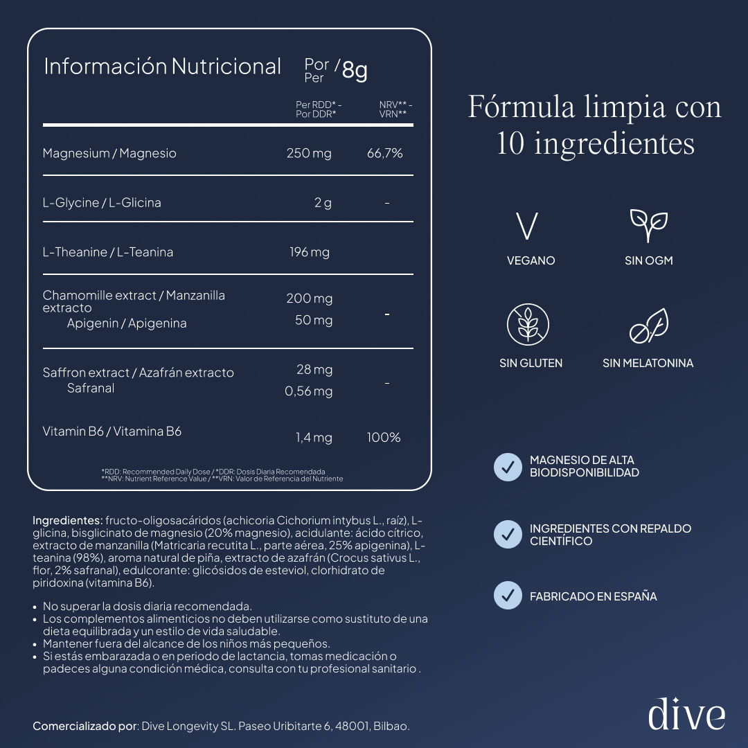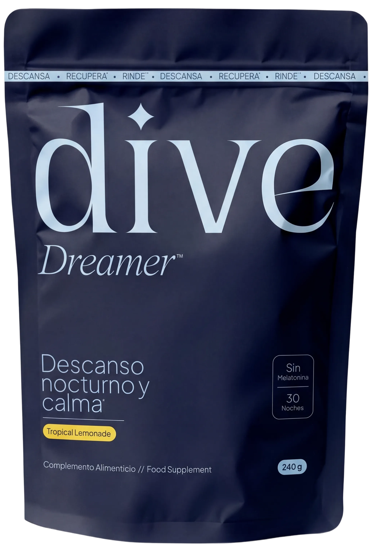 Dive no está diseñado para generar dependencia. No actúa forzando el sueño, sino apoyando los mecanismos naturales de relajación, arquitectura del sueño profundo y recuperación nocturna. Puedes tomar una dosis cada noche como parte de tu ritual, y hacer descansos cuando lo desees; lo importante es que siga acompañando unos buenos hábitos de higiene del sueño