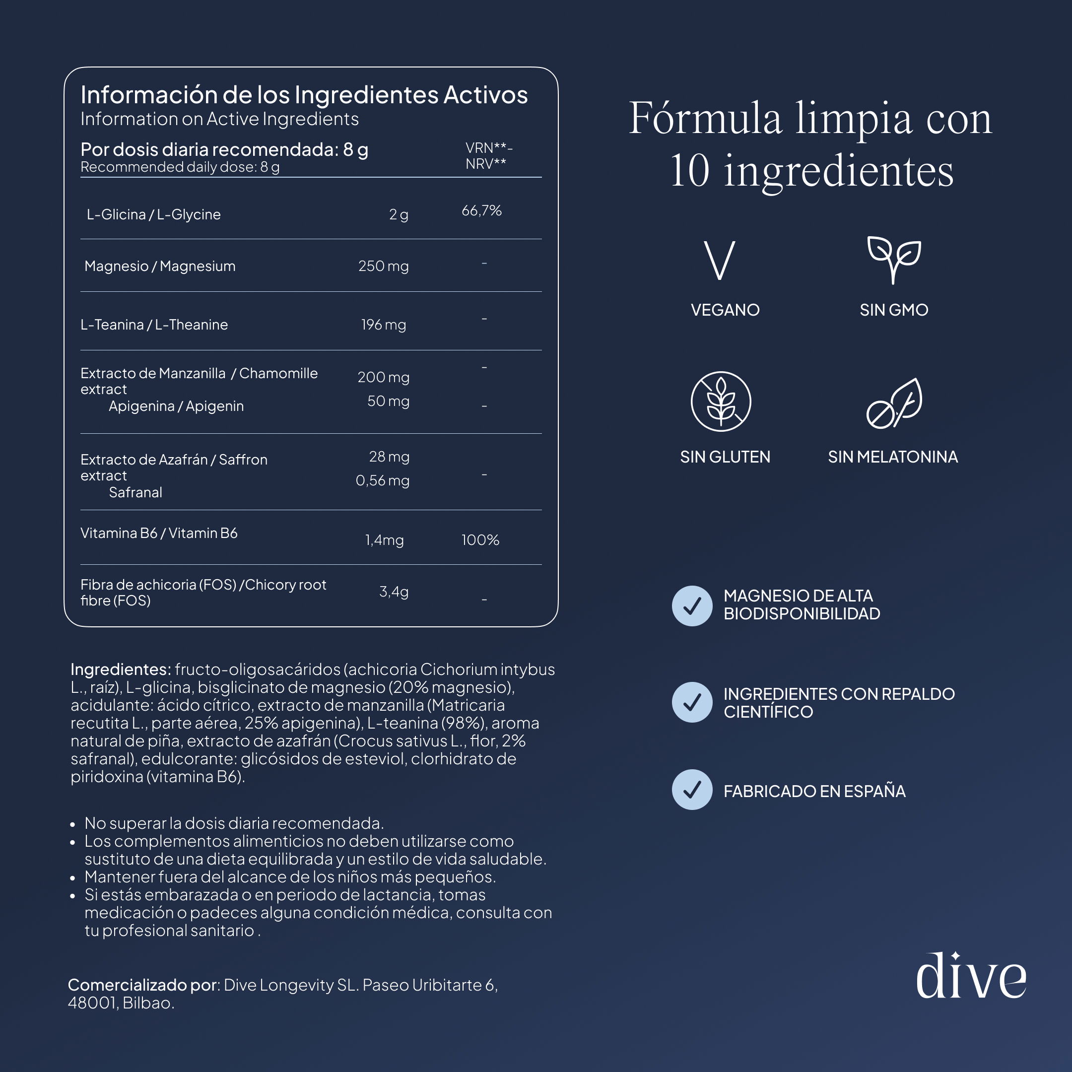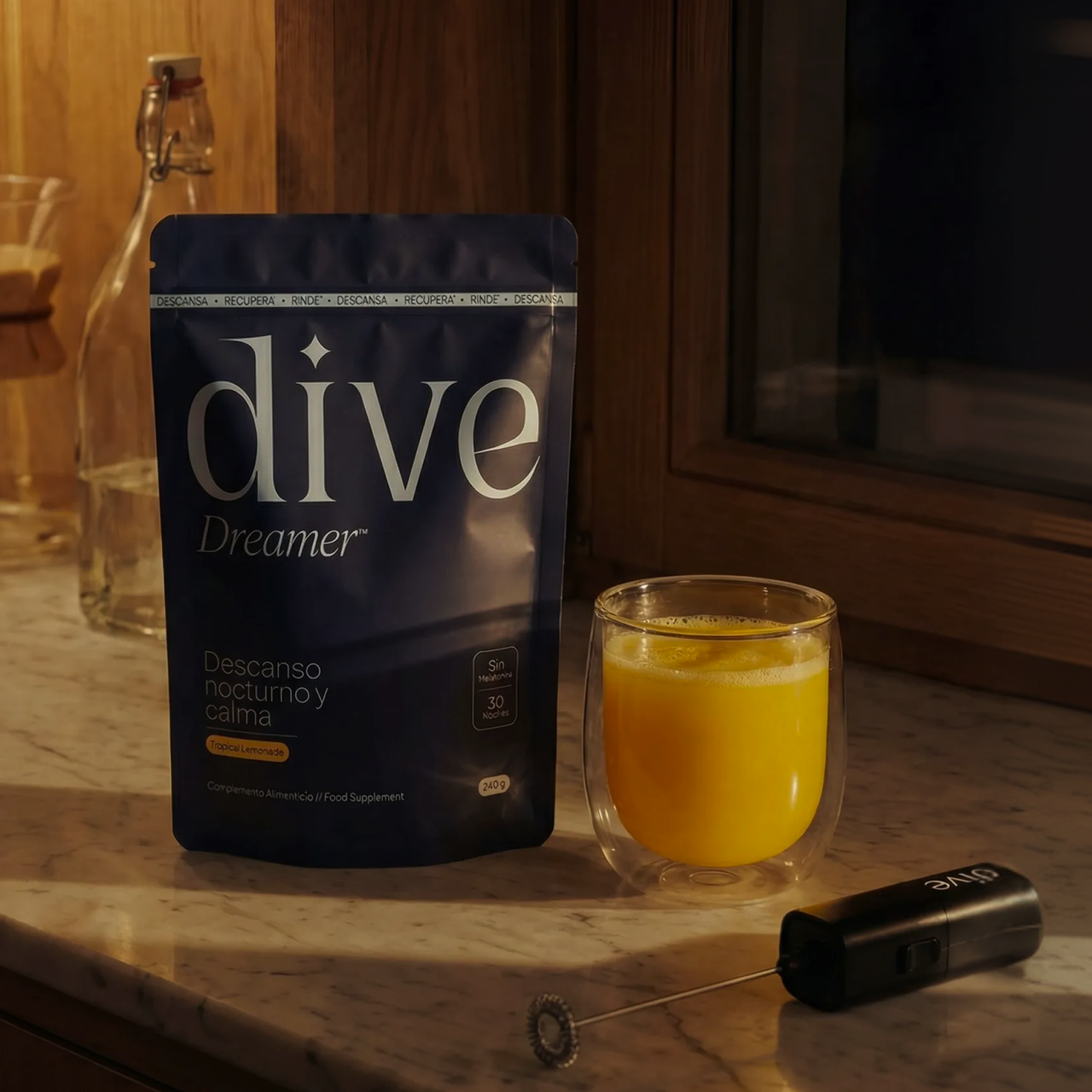 Dive no está diseñado para generar dependencia. No actúa forzando el sueño, sino apoyando los mecanismos naturales de relajación, arquitectura del sueño profundo y recuperación nocturna. Puedes tomar una dosis cada noche como parte de tu ritual, y hacer descansos cuando lo desees; lo importante es que siga acompañando unos buenos hábitos de higiene del sueño