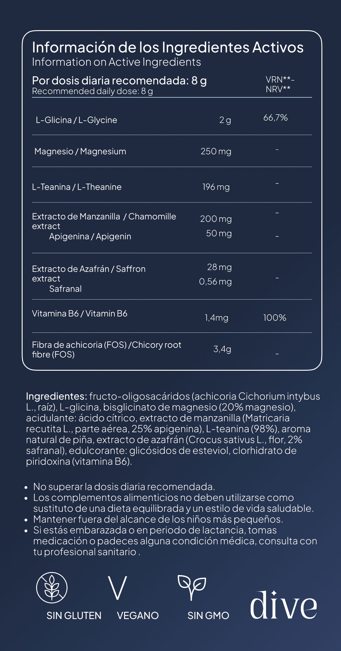 Dive está formulado con ingredientes naturales y seguros para adultos sanos. Sin embargo, por transparencia y responsabilidad, si estás embarazada, en periodo de lactancia o tomas medicación específica (especialmente sedantes o antidepresivos), te recomendamos consultar con tu médico antes de incorporar cualquier suplemento a tu rutina. Queremos que tu descanso sea seguro y efectivo.